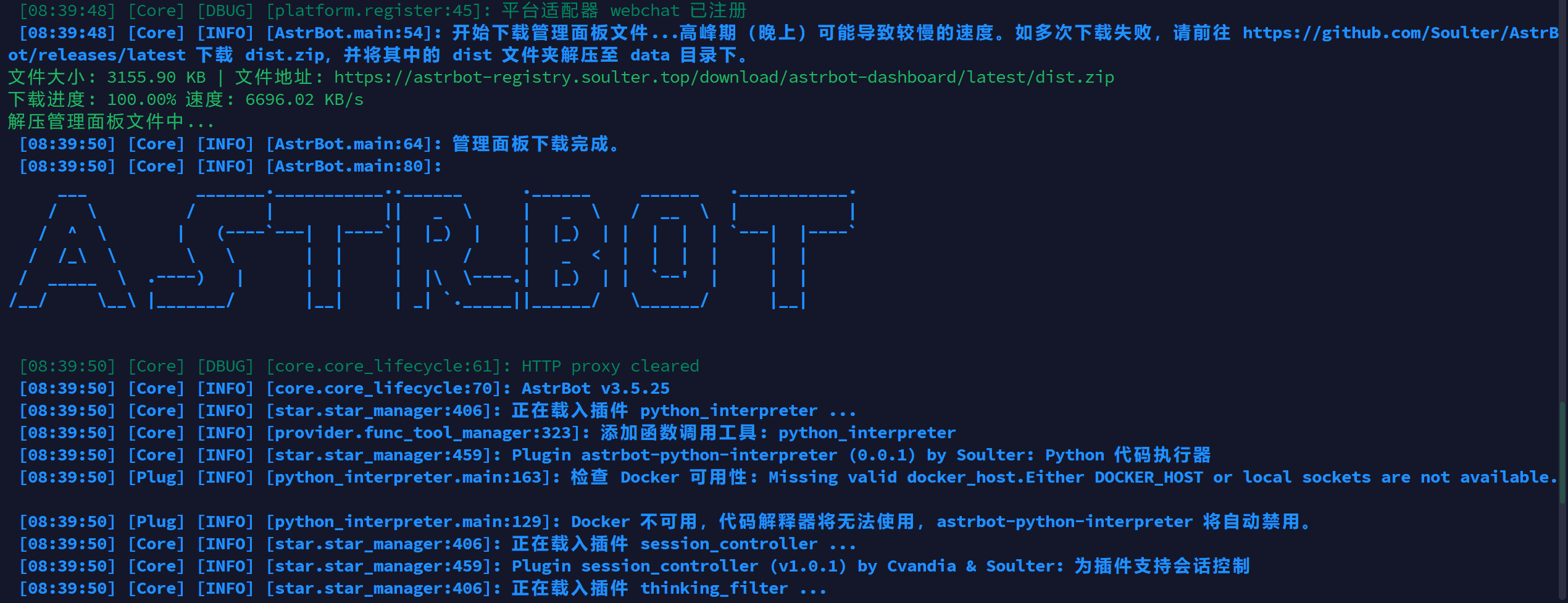 两个容器都接入了同一个网络 astrbot_network,所以它们能直接互相通信。外部访问时则通过端口映射进入。